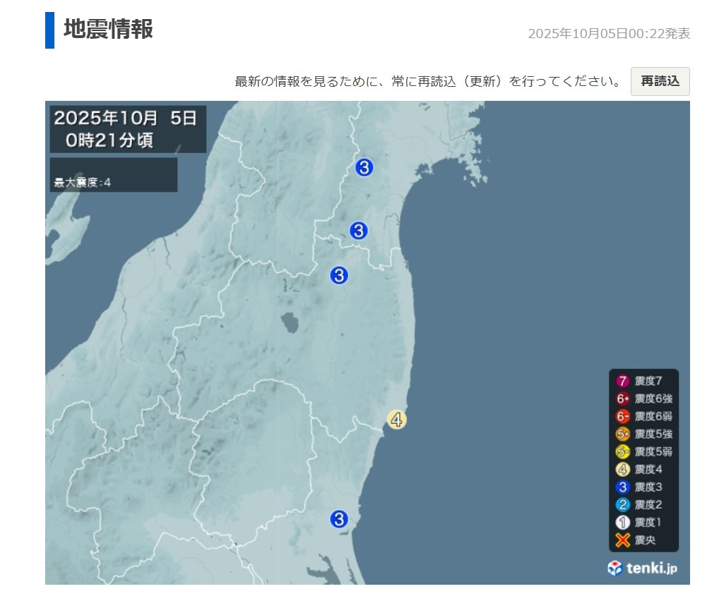 【202510/05(日)】 福島県で震度4の地震がありました。