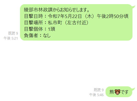 【2025/05/22(木)】 近くにクマが出没! 災害ではないですがこういうのもお知らせします。