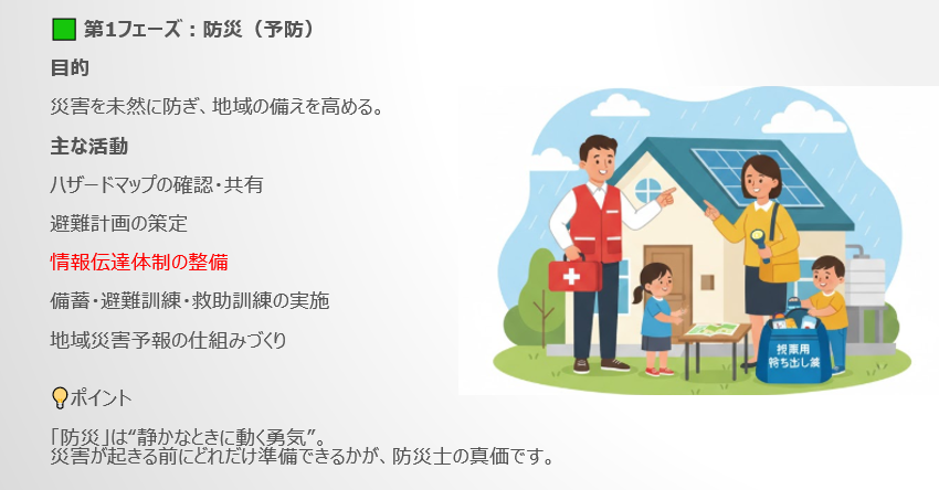 防災士の活動は、時間の流れに沿ってこの3つの段階に整理できます。