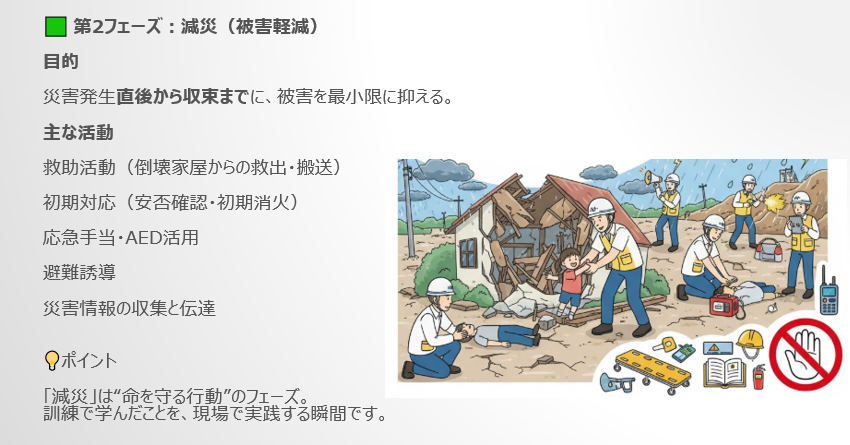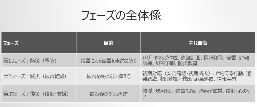 〜 第1フェーズ:防災 第2フェーズ:減災 第3フェーズ:復災 〜
