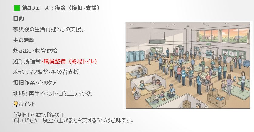 災害の災害前・災害の最中(直後も含む)・災害後 ――この3つのフェーズに分けて整理することで、活動の全体像が見えてきます。